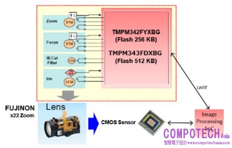 作為一款智能監控應用,本方案通過TOSHIBA的M342/M343 MCU,可驅動鏡頭的Zoom/Focus/IR cut/IRIS等功能,且若是鏡頭需要做上下與轉動角度(Pan/Tilt)的設計,只需再添加TOSHIBA的電機驅動IC TC78H670FTG,便能夠快速實現與整合在產品的應用上。