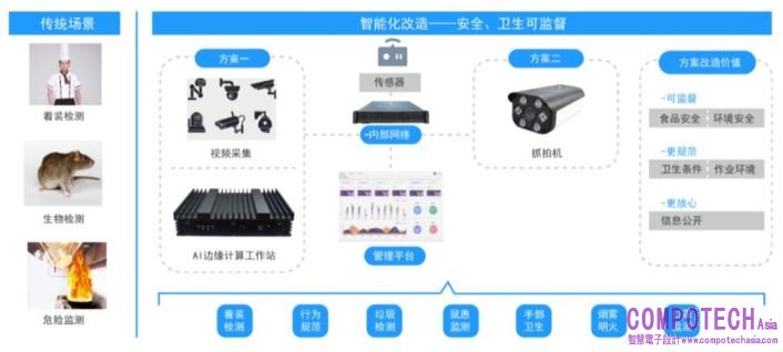 食品安全問題關係著千家萬戶的健康。為了保障人們的食品安全,自2014年2月起,國家食藥監總局就開始在各地餐飲業開展明廚亮灶工作。倡導餐飲服務提供者通過採用透視明檔(透明玻璃窗或玻璃幕牆)、視頻顯示、隔斷矮牆、開放式廚房或設置窗口等多種形式,對餐飲食品加工過程進行公示,以實現後廚透明化監管,提升監管效率,降低人力成本。順應此趨勢,大聯大世平基於Cambricon產品推出AI明廚亮灶方案,此方案以寒武紀的MLU220處理器為核心,採用英碼科技的AI視覺辨識技術,能夠為企業和消費者提供後廚“透明化”監督與管理。
