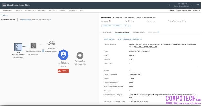 深入洞察安全風險:使用者現在可以利用多雲搜索來檢查 Kubernetes 資源配置並將與叢集內部或外部其他資源的關係視覺化,由於支援 1000 個安全最佳實踐和 20 個合規框架,用戶可以主動識別高階風險以防範雲端劫持,例如 Kubernetes ServiceAccount 角色與雲端帳戶管理員 IAM 角色之間的連接(圖-2)。憑藉對 Amazon EKS 的支援,Azure Kubernetes Service、GoogleKubernetes Engine 、 Tanzu Kubernetes Grid 、 Red Hat OpenShift 、 Rancher 和 其 他Kubernetes 開發者團隊可以改善基礎架構的安全性與合規性,為他們在公有雲或資料中心的現代應用提供支援。