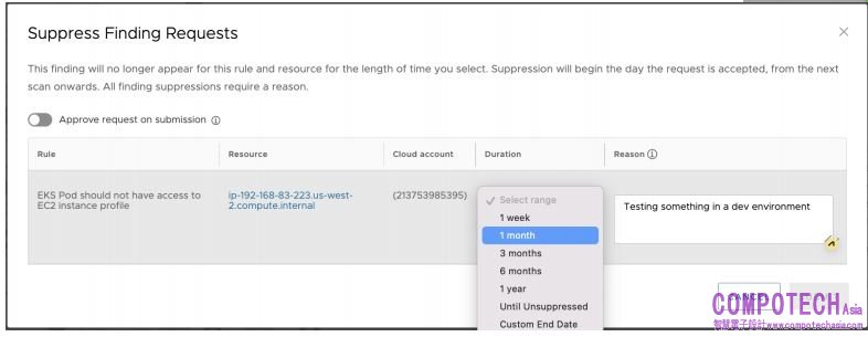 更容易實施安全措施:在一個大型企業中,實現雲端安全的關鍵在於將警報高效傳遞至分佈在各地的團隊並減少誤報。CloudHealth Secure State 提供一個先進的警示方塊架,使管理員能夠自訂警報資訊,提供公司安全政策和補救步驟方面的指導。透過自動化,開發者可以根據預先定義的標準(如安全政策、風險或資源標籤)請求安全政策例外,以便減少警報數量。管理員則可以拒絕無效的請求或批量批准特定期限的安全例外(圖-3),並藉由互動式工作流程確保安全管理員和開發者的合作效率,最大程度地降低風險。