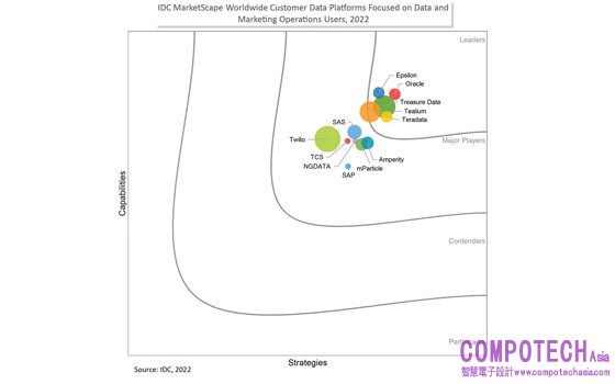 IDC MarketScape 報告針對12家客戶資料供應商CDP在行銷技術和營運、資料科學和分析、IT、資料營運以及隱私和合規方面進行能力與市場戰略的評選,並將評選結果分為領導者(Leader)、主要參與者(Major Players)、競爭者(Contenders)和參與者(Participants)四個層級。