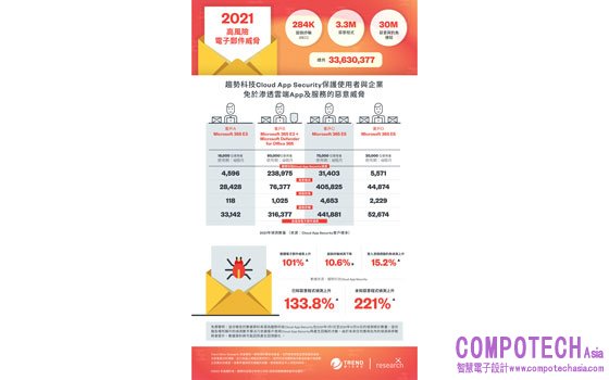 2022年7月7日--全球網路資安領導廠商趨勢科技 (東京證券交易所股票代碼:4704) 在 2021 年共攔截了 3,360 萬次以上的雲端電子郵件威脅,較前一年暴增 101%。如此大幅度成長的電子郵件攻擊數量,顯示電子郵件仍是網路攻擊的首要途徑。