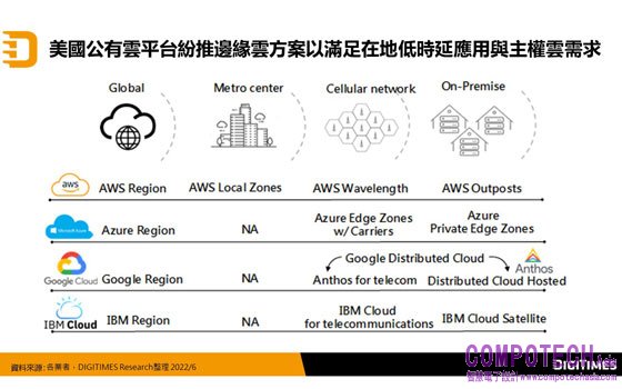 2022年7月13日--DIGITIMES Research觀察,美國四大公有雲平台業者近年積極布局邊緣雲端服務,一是因應各國對數據資安的管理越趨嚴謹,邊緣雲架構更能落實數據儲存本地端的要求;二是5G世代納入低時延通訊指標,邊緣雲與5G網路結合有利擴展垂直產業市場。值得注意的是,公有雲業者與電信營運商在邊緣應用市場有朝深化合作的趨勢,是否影響電信產業推動自有電信邊緣雲架構/標準,將是可持續關注的議題。