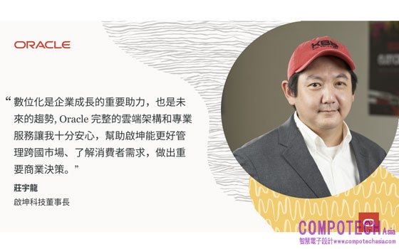 啟坤科技董事長莊宇龍表示:「我認為數位化是企業成長的重要助力,也是未來的趨勢,採用雲端幫助啟坤能更好管理跨國市場、了解消費者需求,做出重要商業決策。Oracle 完整的雲端架構和專業服務讓我十分安心,企業不用承擔資料遺失的風險,也能在遇到後端問題時,得到 Oracle專業的即時服務。接下來我們也希望能採用 Oracle Analytics Cloud 及 Machine Learning 服務,讓工廠營運更加智慧化,並能更有效率地開發及生產產品。」
