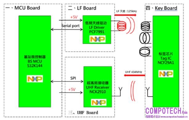 除此之外,本方案在接收端採用了NCK2910特高頻接收晶片,其內部集成了多通道超高頻發射器,具有極低的功耗特性。在鑰匙端本方案採用了NCF29A1標簽晶片,其具有出色的LF(低頻)靈敏度以及低功耗特性,可實現較長的電池使用壽命。