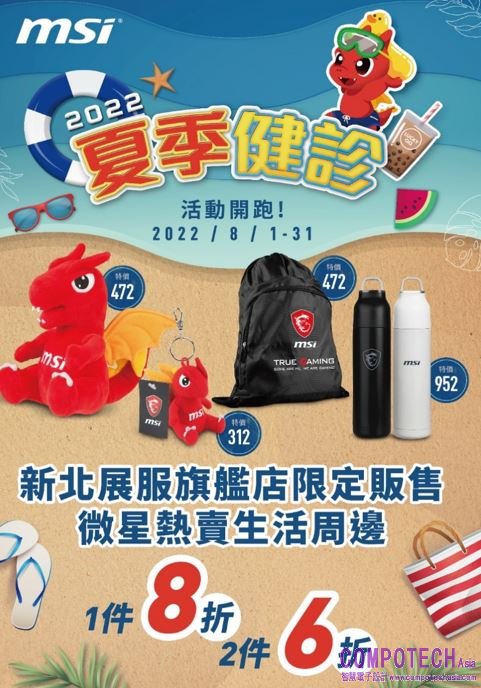 微星生活周邊小物一直深受許多人喜愛,有非常受歡迎可愛的吉祥物lucky造型布偶和鑰匙圈,還有方便好用的龍魂束口後背包,及黑白兩色質感時尚提把保溫瓶(500ml),都將在健診期間享單品8折,任選兩件更享6折優惠,活動時間從8/1開始到8/31止,微星新北展服旗艦店限定販售,機會難得趕緊把握健診特賣活動,購入喜歡的生活周邊。