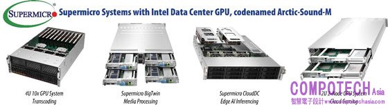 Supermicro 採用Intel Data Center GPU (代號 Arctic Sound-M)的解決方案,包括了適用轉碼和媒體交付的 4U 10顆GPU伺服器、適合媒體處理應用的 2U Supermicro BigTwin® 系統 (可搭載多達 8 個 Intel Data Center GPU)、用於邊緣 AI 推論的 Supermicro CloudDC 伺服器,以及針對雲端遊戲最佳化設計的 Supermicro 2U 2 節點伺服器(搭載3個 Intel Data Center GPU)。其他系統將於今年稍後推出。