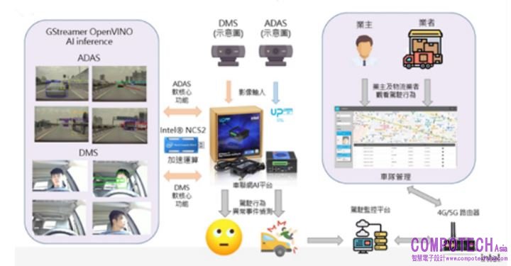 本方案可即時分析輔助駕駛並讓管理者瞭解駕駛行為表現。在系統運行時,由兩台Webcam採集車前及駕駛室影像,並上傳至車聯網平臺,然後將影像分流至OpenVINO平臺進行AI推斷,再將異常事件上傳至駕駛監控平臺,管理者能通過駕駛監控平臺得知當前的駕駛狀態,以便進行員工教育,提升駕駛素質,保障駕駛員及路人的生命安全。