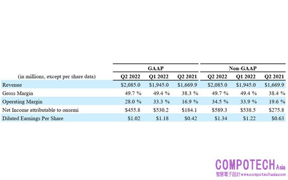 2022年8月2日--安森美(onsemi,美國納斯達克股票代號:ON)公佈其2022年第2季度業績,亮點如下: