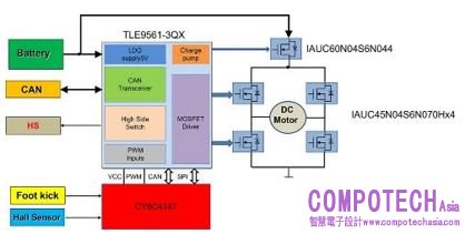 本方案採用的關鍵晶片是Infineon旗下的PSoC4系列車規級MCU CY8C4147LQE與MOTIX車規級電機驅動TLE9561。其中,CY8C4147LQE基於ARM Cortex™-M0+內核,具有48MHz的主頻,集成了豐富的外設資源。並且CY8C4147LQE帶有電感感應,能夠滿足腳踢感應開門的應用場景。