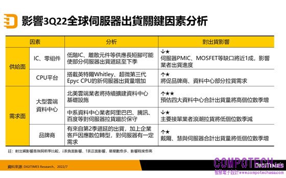 預期第3季雲端及企業需求增長、IC供給長短腳將較緩解,加上第2季出貨遞延,全球伺服器出貨將維持成長力道,惟中系伺服器業者出貨表現將因疫情影響經濟成長放緩,以及政府對大型資料中心(如阿里巴巴、騰訊等)採較嚴格的網路安全監管措施,使拉貨速度減緩,且PMIC、MOSFET等供應在原廠新產能釋出有限下,短缺恐仍逾1成,因此預期全球伺服器出貨季增幅度為5.2%。