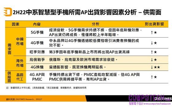2022年第2季起,中系品牌銷售不振,手機成品庫存堆積問題逐漸浮上檯面,加上新興市場4G手機換機情況受通膨影響而不如預期,無論4G及5G手機用AP出貨皆不佳。業者表現方面,高通(Qualcomm)在市況不利下並未降價,使聯發科2022年第2季AP出貨仍可維持季增。