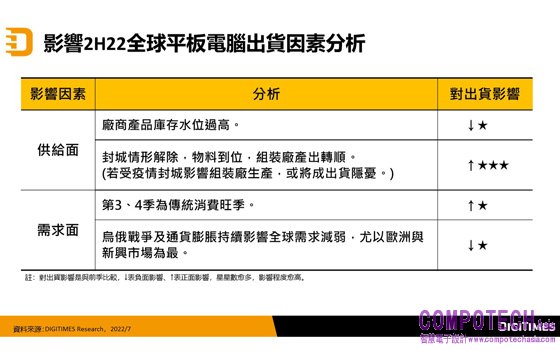 2022年8月19日--根據DIGITIMES Research分析師郭宜玲統計與分析,2022年第2季全球平板電腦(Tablet)出貨為3,195萬台,低於預期,整體市場除受需求端消費淡季、通貨膨脹壓力擴張等負面影響,亦有中國封城政策對供給端造成的衝擊,品牌業者中以蘋果(Apple)所受影響最大。預期第3季進入傳統出貨旺季,加上因封城導致的出貨遞延,將增添全球平板電腦出貨動能,預估出貨季增17.5%,達3,755萬台。