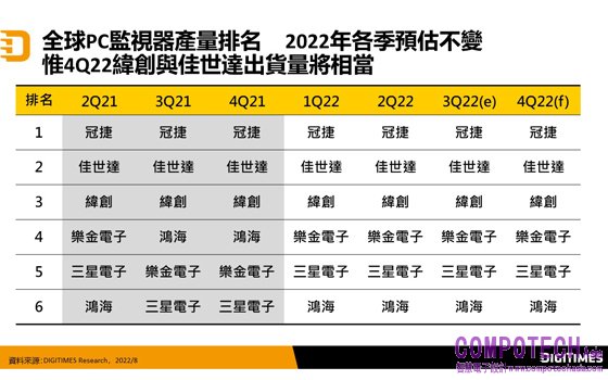 展望第3季,由於大環境景氣等需求面不佳,預料台廠PC監視器出貨量在旺季仍恐小幅季減3~4%,同時再落入年衰退,其中,冠捷將衝刺全年出貨,在其他業者表現不佳的對比下,佔台廠比重有望明顯回升,而緯創則將進一步威脅佳世達出貨地位。