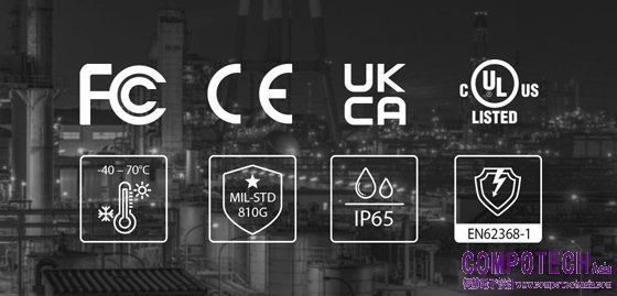 耐震動及衝擊能力則是通過MIL-STD-810G/ IEC 60068-2-6、IEC60068-2-27等認證,確保產品能於運送、運作及儲存過程中承受撞擊後不受損。