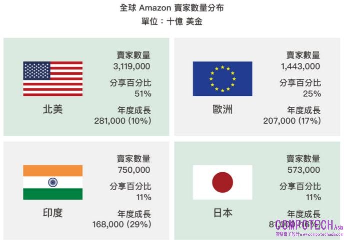 Amazon是2021年歐洲唯一每個月線上造訪次數破10億次的電商網站,其中貢獻最多的就是英國、法國和德國,在全球甚至可以排到前五名。