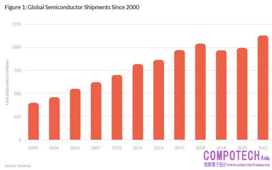 儘管最近發生的影響廣泛的全球事件對每個行業都提出了挑戰,但半導體行業仍然充滿活力,並繼續保持增長勢頭。據行業分析公司 Statista 給出的預測資料,2021年半導體年出貨量達到歷史最高水準(如圖1所示),即出貨量將達到 1.14 萬億件,總價值約為 4700 億美元。這一創紀錄的增長也將為半導體行業帶來一系列挑戰。