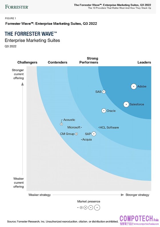 2022年9月22日--Adobe(Nasdaq:ADBE)於2022年Forrester 最新供應商評估報告中表現出色,不僅在包括數據管理平台 (DMP)、即時互動管理、內容和資產管理等25 項標準中獲得最高分,更是在第三季度的「The Forrester Wave™:企業行銷軟體套組」(Forrester Wave™: Enterprise Marketing Suites, Q3 2022)類別中被評為領導者。