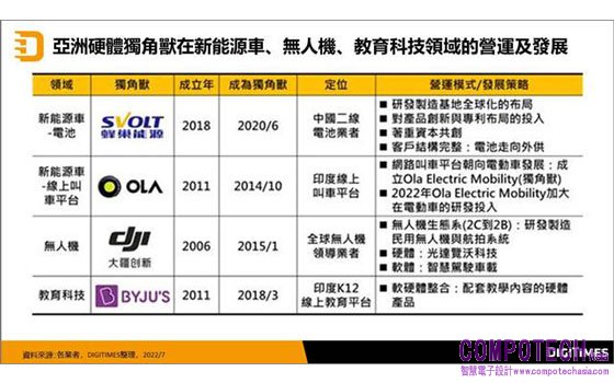 另外,線上叫車平台為亞洲國家汽車領域獨角獸新興發展模式,形成「車企與平台整合」、「純線上平台」兩大發展類型。在硬體領域,中企大疆創新(DJI)無人機獨角獸的下階段布局,企圖與車企合作延展至智慧駕駛領域。在教育科技方面,疫情加速印度BYJU'S獨角獸K12線上教育平台發展以平台經濟驅動的硬體銷售商機。