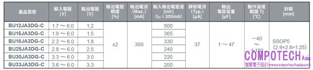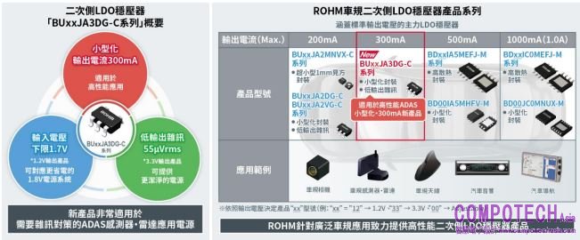 新產品「BUxxJA3DG-C系列」滿足了車規產品的基本要求,比如125℃工作、符合汽車電子產品可靠性標準「AEC-Q100」、車電二次側LDO穩壓器所需的小封裝尺寸,以及輸出電壓擴展需求。