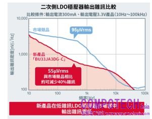 此外,儘管體積非常小,卻支援高達300mA的輸出電流,以及1.7V至6.0V的更寬輸入電壓範圍。即使在1.7V輸入電壓、300mA輸出電流條件下也能穩定工作,因此也可用於1.8V的電源系統(適用產品:BU12JA3DG-C)。不僅如此,輸出雜訊更降低至55µVrms,比市場競品降低約40%(與輸出電壓3.3V的產品相比),這使其對感測器等微小的電訊號輸出不容易產生影響(有助提高精度),因此非常適用於對雜訊敏感、日益小型化和高性能化的車電產品電源。