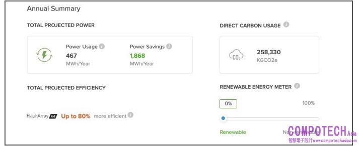 評估報告:客戶可使用Pure1來評估如何改善電源效率,從陣列讀出的數據當中計算每一資料單位的消耗瓦數。