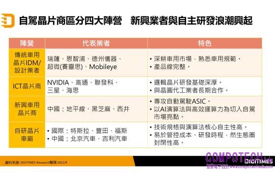 2022年10月5日--DIGITIMES Research分析師簡琮訓依業者所處利基點觀察,指出自駕晶片商可分為四大陣營,各擁優勢。自駕晶片商供車廠開發軟體與演算法的開放程度,及晶片AI運算力為車廠選用的重點考量。現階段投入自主研發自駕晶片的車廠仍為小眾,雖自行開發可全然掌握開發方向,然面臨成本與法規等嚴苛挑戰。未來隨新興IC設計業者與車廠自主研發浪潮興起,自駕晶片市場將進入戰國時代。