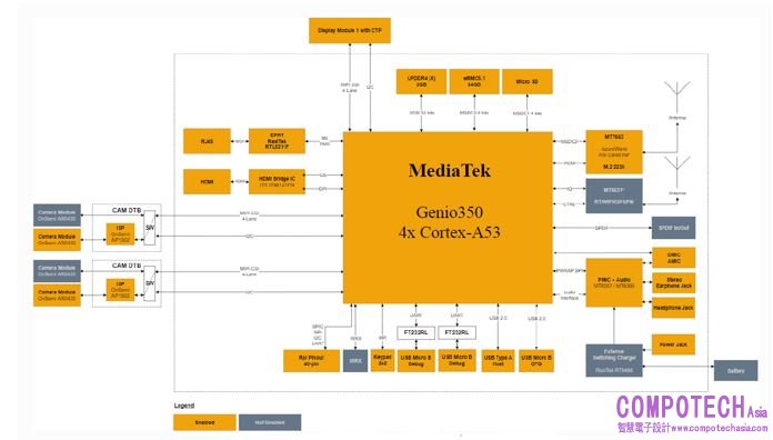 MediaTek Genio350是高度集成的邊緣人工智能平臺,其結合了專用的APU(人工智能處理器)和DSP(數位訊號處理器),專為需要視覺和語音邊緣處理的邊緣應用而設計。其支援具有觸摸界面和豐富應用程序的高清顯示器,是智能設備、智能訪問、零售、自動售貨機或POS等公共接口的理想平臺。