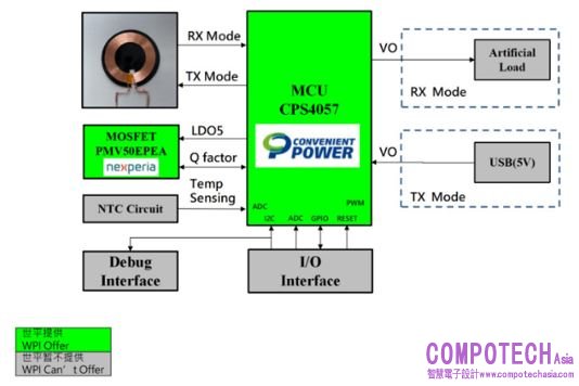 易沖半導體(ConvenientPower)是國際無線充電盟WPC共同創始人之一,也是全球第一家推出兼容Qi標準產品的公司。本方案中採用的CPS4057是一個高效且符合Qi協議的無線充電接收/發送集成系統。其接收端方案兼容Qi-BPP/QI-EPP標準,能夠提供5W/10W/15W/50W輸出功率。發射端方案支援輸入電壓5-10V,能夠提供5W輸出功率。同時,CPS4057有原廠提供配套的E-link燒錄器,可以通過I2C進行通訊。