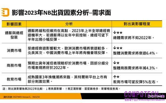 2022年10月21日--DIGITIMES Research分析師蕭聖倫觀察,2022年NB巿場在後疫情需求已相對飽和下,又遭遇全球通膨、烏俄戰爭及成熟國家激進升息等黑天鵝事件,加上供應鏈仍不穩定,使出貨從第2季開始急轉直下,全年出貨將衰退超過2成。2023年需求面仍將充斥總經不利因素,NB出貨仍將小幅衰退;2024年預期景氣復甦、處理器平台競爭加劇有利NB性價比提升,巿場可望恢復小幅成長。2025~2026年間巿場因Windows 10停止支援及OLED普及,可刺激NB換機而持續處增長軌道,2027年則略為減速。