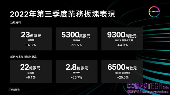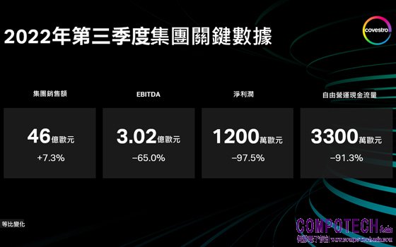 「整體經濟形勢進一步呈現顯著疲態,這也影響到我們的業績。雖然極高的能源和原材料價格給我們帶來了巨大壓力,但我們仍達成了第三季度的EBITDA預期目標。」科思創財務長陶鵬飛博士(Dr. Thomas Toepfer)表示,「根據這些結果,我們仍有望實現我們為自己設定的全年目標。」