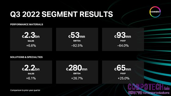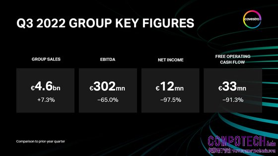 如預期所料,當前歐洲能源危機導致的能源和原材料價格上漲,對科思創2022年第三季度業績造成顯著影響。然而,由於匯率波動、銷售價格水準大幅提高(特別是歐洲地區),集團銷售額同比增長7.3%至46億歐元(去年同期:43億歐元)。第三季度稅前息前折舊前攤銷前利潤(EBITDA)下降65.0%至3.02億歐元(去年同期:8.62 億歐元),達成預期目標。盈利下降的主因是利潤率降低,因為集團提高銷售價格水準只能小幅抵消原材料和能源價格的大幅上漲。此外,產品總銷量下滑也使盈利降低。自由營運現金流量(FOCF)下降91.3%至3300萬歐元(去年同期:3.81億歐元),主要原因在於經營活動產生的現金流減少。第三季度淨利潤下降97.5%至1200萬歐元(去年同期:4.72億歐元)。