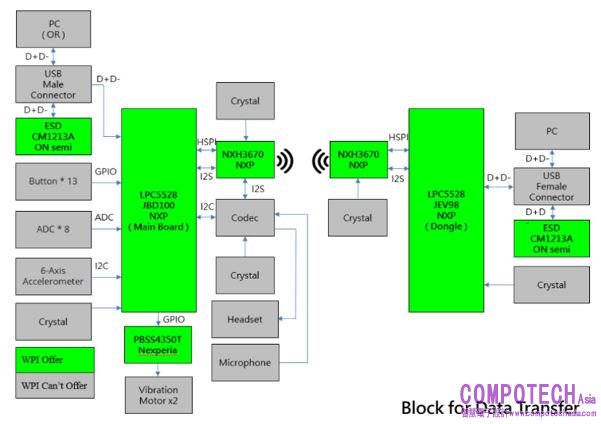 本方案中採用的NxH3670是用於音訊流的具有超低待機功耗的2.4GHz BLE收發器,其高度集成了2.4GHz無線收發器和嵌入式MCU,可支援無線手持設備和耳機上的無線音訊流。此方案中應用的LPC5528 MCU基於Arm Cortex M33(150MHz)內核,帶高速USB與Audio的無線傳輸架構,其規格更具有市場競爭力且更貼近玩家的需求。