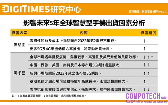 2022年11月2日--DIGITIMES研究中心分析師林俊吉綜合供應鏈訊息、各區域市場狀況及觀察全球政經走勢分析,下調2022年全球智慧型手機預估出貨量至11.7億支水準,年衰退10.7%;展望未來5年,COVID-19(新冠肺炎)疫情、烏俄戰爭、美國升息及全球通膨等負面影響將逐年減小,而5G換機潮及新興市場功能手機用戶換購低價智慧型手機的趨勢持續,市場將回復成長,林俊吉預估每年出貨成長率將落在2~9%,年複合成長率(CAGR)估4.8%。