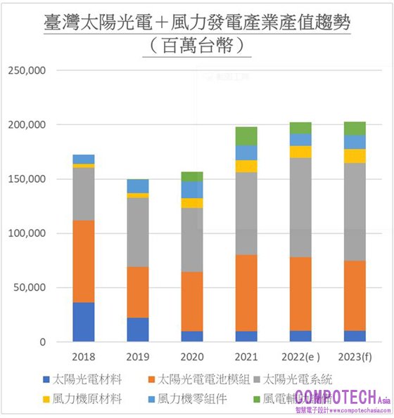 臺灣近年致力於太陽光電、風力發電的導入,也有相當的成果,進一步帶動臺灣再生能源企業的轉型成長;ISTI預估2022年太陽光電及風力發電相關產業產值可突破兩千億大關,可達2,023億元,成長約2.2%。