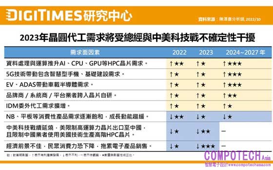 DIGITIMES研究中心分析師陳澤嘉觀察,2022年手機、NB等終端產品雖進入庫存調整期,然全球晶圓代工業年營收仍在漲價、長約等因素下,表現相當亮眼。展望2023年,考量終端產品庫存調整將延續至2023年上半,甚至總體經濟前景不佳將影響民眾消費意願,恐拉長終端產品庫存調整期,2023年全球晶圓代工營收恐減少2~3%。