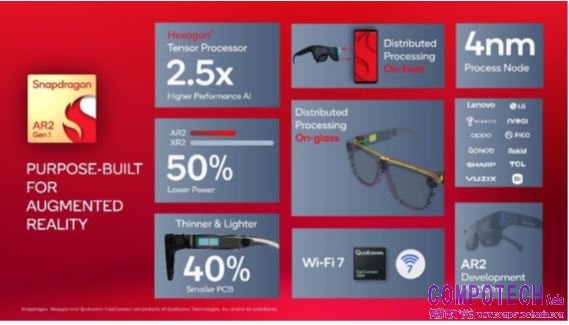 專為AR打造:,透過建立一多晶片分散式處理架構,並結合客製化的IP區塊,以盡可能打造最薄的高效能AR眼鏡。AR2主處理器在眼鏡中的PCB面積縮小40% ,整個平台的AI效能提升2.5倍,同時功耗降低50%,以協助打造功耗低於1瓦的AR眼鏡。這讓使用者能在可長時間舒適配戴的眼鏡上享受豐富的AR體驗,並滿足消費者和企業使用案例的需求。