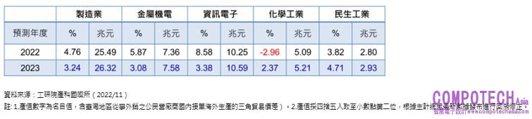 工研院綜整政經情勢,今(29)日舉辦「2023年臺灣製造業暨半導體產業景氣展望記者會」,發布2023年臺灣製造業及半導體景氣展望預測結果。工研院向下修正2022年製造業產值為25.49兆元新臺幣,年增率4.76%。展望2023年,國際需求不振,連帶影響臺灣成長動能,臺製造業需謹慎前行。預估製造業四大業別維持小幅成長,整體製造業產值達26.32兆元新臺幣,年增率預估為3.24%。臺灣半導體產業在2023年正式進入3奈米量產新世代,IC設計業持續採用最先進的半導體製程技術,為全球市場設計出最具運算效能的晶片,同時,IC封測業為全球市場提供先進的異質整合封裝技術,為全球市場提供所需要的晶片。工研院預估臺灣半導體產業在2023年度總產值可持續攀升至新臺幣5.0兆元,年成長率達6.1%,優於全球-3.6%的成長率。