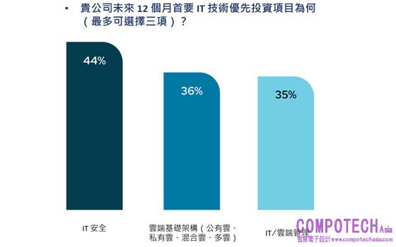 44% 受訪者將安全性視為前三重要的投資經費優先項目,為本調查中跨區域、跨產業的 IT 投資要項首選,較第二順位的雲端基礎架構(36%)高出 8 個百分點。深入分析企業安全投資規劃,又以網路安全(40%)與雲端安全(38%)為重點,第三方或供應鏈風險管理(12%)、安全或合規性專員配置(13%)排行末位,其原因可能是投資優先項目通常只反應相對高價的產品,而非企業內部針對人員與流程的投資。
