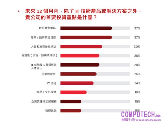 在非 IT 投資優先項目中,分別有 37% 受訪者選擇專業/技術技能培訓與數位轉型策略,兩者並列第一,人員/流程技能培訓(30%)居第三位,IT 或開發人員招募與人才留任(28%)則緊隨其後。或許是受不斷變化的市場狀況及緊俏勞動市場影響,2022 年所有首要非 IT 投資優先項目皆與提升技能、人才相關,不僅促使企業重新定義數位轉型策略和優先項目,也在招募、留任人才及再培訓(reskill)技能層面發揮更多創意。