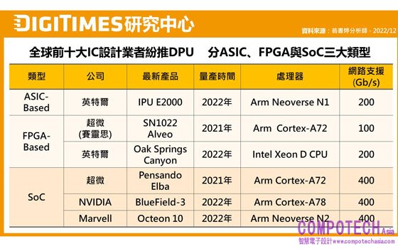 2022年12月28日--DIGITIMES研究中心分析師翁書婷觀察,數據處理單元(Data Processor Unit;DPU)主力業者NVIDIA、英特爾(Intel)、超微(AMD)、博通(Broadcom)與Marvell等,多透過購併快速進入市場,支援P4語言的網通晶片為重要技術選項,此外,亞馬遜(Amazon)、微軟(Microsoft)與阿里巴巴等雲端服務業者亦自行研發DPU,然DPU未來發展將受美國最新禁令影響,中國業者將難獲取高運算力版本DPU,而中國業者自研亦受限。