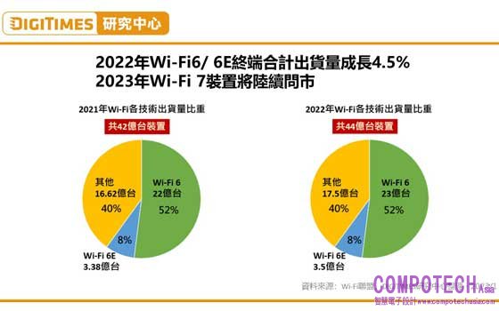 2023年1月11日--DIGITIMES研究中心分析師簡琮訓觀察,以擴增6GHz頻段為亮點的Wi-Fi 6E目前尚未普及,同樣利用6GHz頻段且有更佳傳輸效率的Wi-Fi 7已接續而來,三大Wi-Fi晶片業者高通(Qualcomm)、博通(Broadcom)、聯發科更是全力開發Wi-Fi 7晶片。Wi-Fi 6/ 6E已足夠應付當前多數傳輸應用場景,使用者對於網速更快的Wi-Fi 7感受差異有限,預料當市場對8K影音串流、AR/ VR等需求增加,Wi-Fi 7才有更大發揮空間。