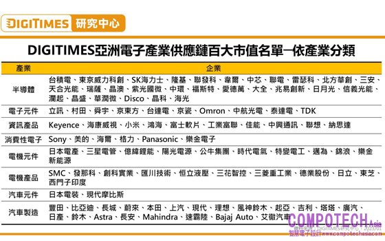 DIGITIMES亞洲電子產業供應鏈市值百大調查以亞洲科技與汽車產業為調查對象,以2022年末為基準,整理出前100家市值最高的亞洲企業,依國別與八大產業類別進行分析,並與2021年調查比較。