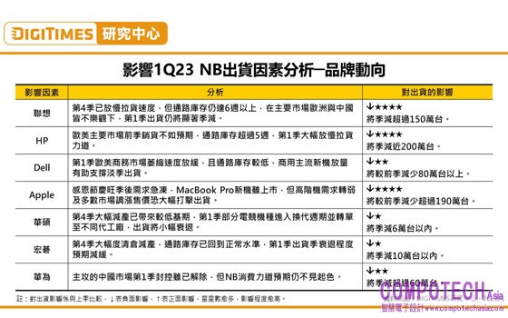 2023年第1季前六大品牌出貨皆將繼續季減,龍頭業者聯想通路庫存仍達6週以上,且主要巿場歐洲及中國前景不佳,預期出貨季減1成5以上;第二名惠普(HP)前季雖有少量訂單回補,但整體通路庫存亦高,第1季出貨預期相當保守,季減幅度恐破2成;第三名戴爾(Dell)前季因商務巿場表現不如預期,出貨已處較低基期,第1季衰退程度可望維持在1成上下。