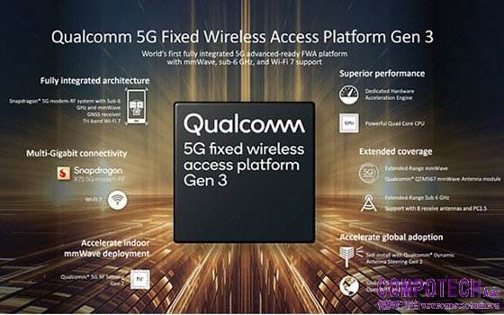 由Snapdragon X75驅動的第三代高通固定無線接取平台(Qualcomm Fixed Wireless Access Platform Gen 3)是全球首款完全整合的5G Advanced-Ready固定無線接取(FWA)平台,支援毫米波、6GHz以下和Wi-Fi 7,包括10Gb乙太網路功能。