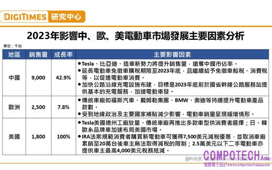 展望2023年全球電動車市場,DIGITIMES Research預估銷售量將超越1,400萬台,其中,中國及美國市場仍將呈現高度成長,主因中國政府延長電動車免徵車購稅至2023年底,而美國車廠持續加增電動車產品線,以及IRA (Inflation Reduction Act)法案擴大補貼範疇;相對的,歐洲車廠雖投資電動車事業計畫不變,然將持續受到俄烏戰爭影響。