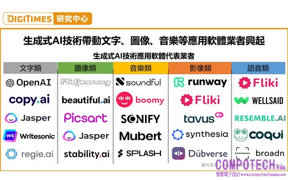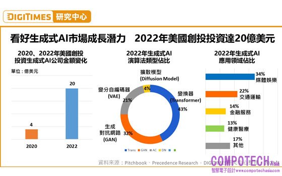 2023年4月12日-- DIGITIMES研究中心分析黃耀漢觀察,ChatGPT熱潮帶動生成式AI市場快速增長,依數據庫業者Pitchbook資料顯示,2022年美國創投投資生成式AI公司金額達20億美元,新創生成式AI應用軟體包含文字、圖像、音樂等類型,而ChatGPT未來商業模式以B2B為主要營收來源。