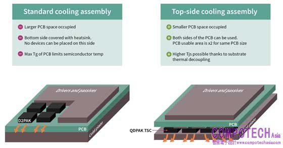 除了提升散熱和功率能力,TSC 技術也提供最佳化的電源迴路設計,因為驅動器配置可以非常靠近電源開關,所以更加穩定。驅動器開關迴路的低雜散電感則可降低迴路寄生效應,因此閘極振盪較少、效能較高、故障風險較小。
