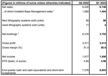 全球半導體微影技術領導廠商艾司摩爾 (ASML)今日發佈 2023 年第一季財報,銷售淨額 (net sales)為 67 億歐元,淨收入(net income) 20 億歐元,毛利率(gross margin)為 50.6%,第一季度訂單金額為 38 億歐元,其中 16 億歐元為 EUV。ASML 同時公布 2023 年第二季財測,預估銷售淨額約65 億到 70 億歐元,毛利率在 50% 與 51% 之間,此外預估 2023 年營收將比 2022 年增長 25% 以上。