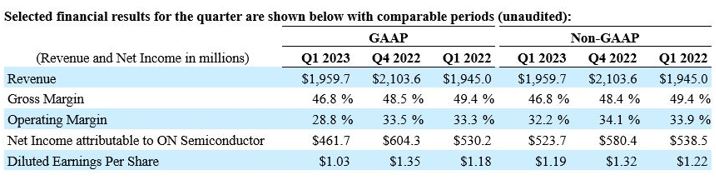 2023年5月4日--安森美(onsemi,美國納斯達克股票代號:ON)公佈其2023年第1季度業績,亮點如下: